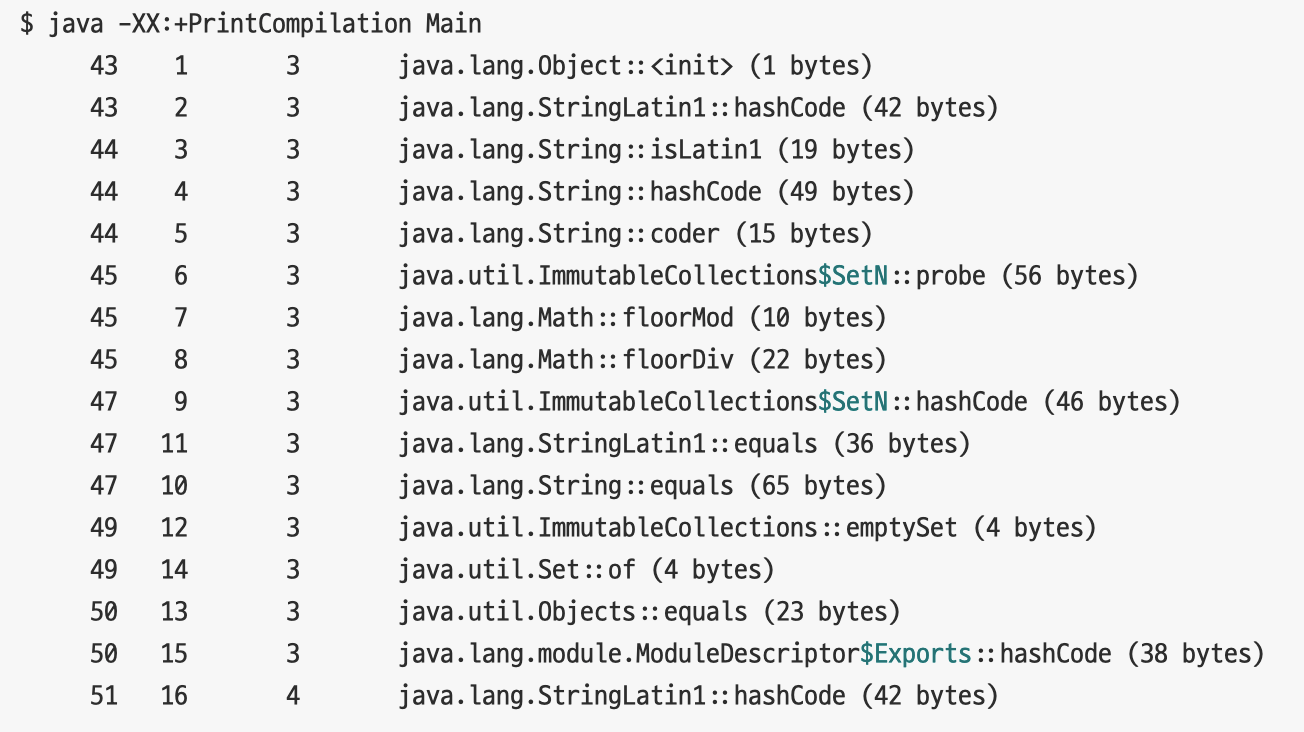 예를 들어서 hello()라는 메소드와 bye()라는 메소드가 있다고 가정해보자. hello() 메소드는 연속으로 3번 호출하고 bye()는 1번 호출한다고 하면 hello()라는 메소드의 사용 횟수가 많기 때문에 4레벨 컴파일러가 hello()메소드를 자주 사용하는 코드로 판단하고 캐싱을 한다. 그래서 다음부터 호출할 때 hello() 메소드는 컴파일 하지 않고 이미 캐싱 되어있는 기계어를 불러온다. 이렇게 해서 인터프리터의 단점을 보완하고 있다. 아래 사진에서 3번째 열이 컴파일 레벨이라고 보면 되는데 실제로 이렇게 실행 되니 참고바란다.