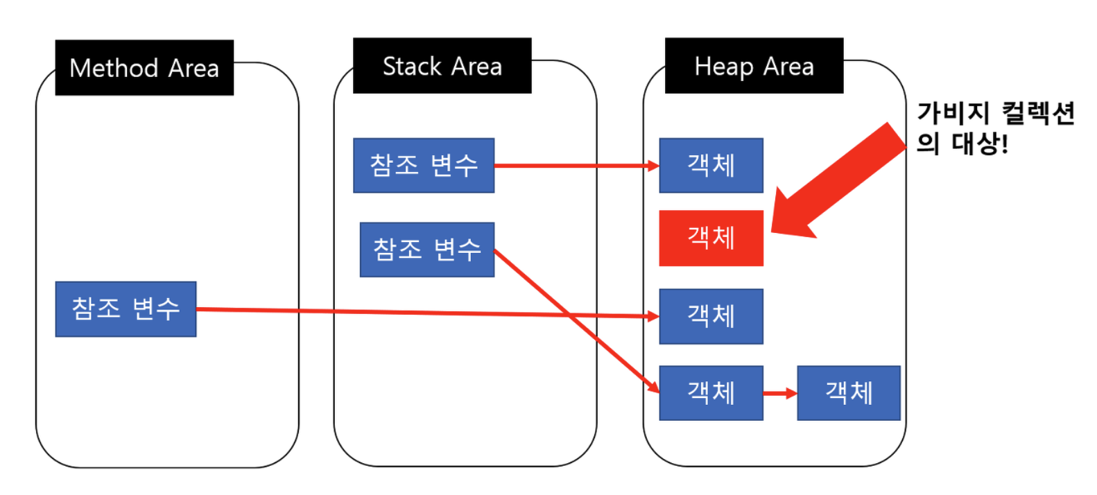 가비지 컬렉션은 Heap 영역에 생성된 객체들을 수거하는 것인데 아무 객체나 랜덤으로 수거하지는 않는다. 위의 그림에서 나타나듯이 Method 영역, Stack 영역에서 참조하고 있는 객체들은 제외 대상이고 참조되고 있지 않는 대상들이 수거가 된다.