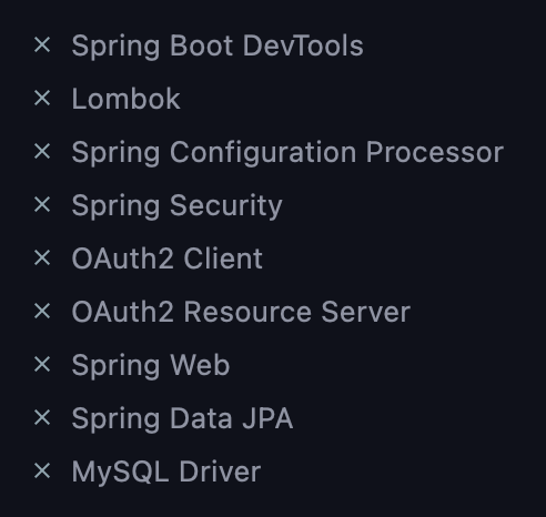 위에서 선택한 것들에 추가로 jwt와 oauth2 autoconfigure를 추가해준다.