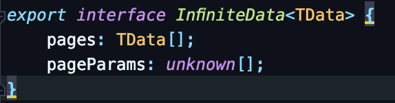 InfiniteData는 useInfiniteQuery를 사용했을 때 받는 Response 구조이다. useInfiniteQuery는 Api 응답이 오면 마지막 페이지의 응답값만 들고 있는게 아니라 각 페이지마다의 응답값(pages)과 페이지 번호(pageParams)를 array에 저장하고 있다. 그렇기 때문에 모바일 앱 같이 스크롤로 리스트를 쓰는 경우에는 화면에 표현해 주기 위해서 1페이지부터 마지막 조회한 페이지까지의 리스트의 모든 응답 값을 합쳐서 보여줘야 한다.