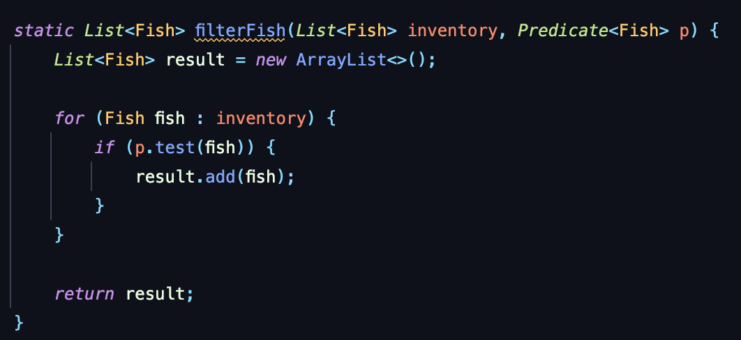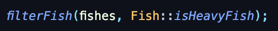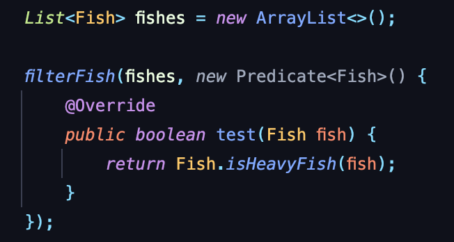 filterFish()라는 메소드를 만들고 파라미터로 필터링 할 리스트와 어떻게 필터링 할지 방법을 전달해준다. 그런데 위의 코드를 보면 메소드가 아니라 객체를 전달해주는 것을 확인할 수가 있다.