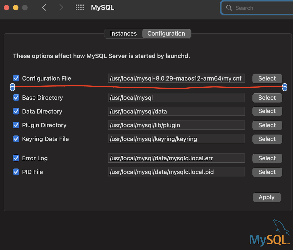 - .dmg로 설치한 것 기준으로 System Prefrence의 MYSQL에 가보면 config 파일을 설정할 수 있게 되어있다. 다른 방법으로 MYSQL을 설치하신 분들은 각자 확인을 해보셔야 될 듯 하다.