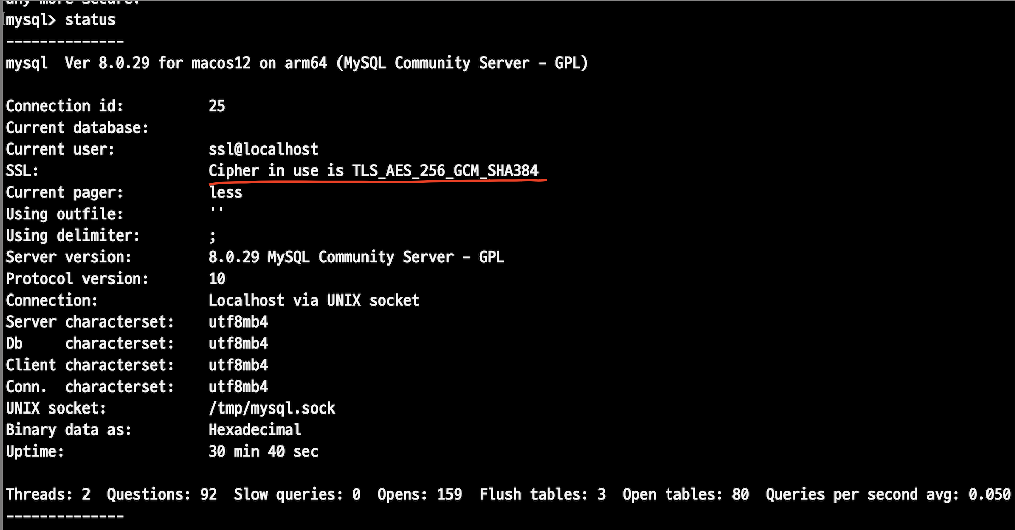 mysql에 status라고 입력하면 SSL로 연결됐는지 확인할 수 있다.