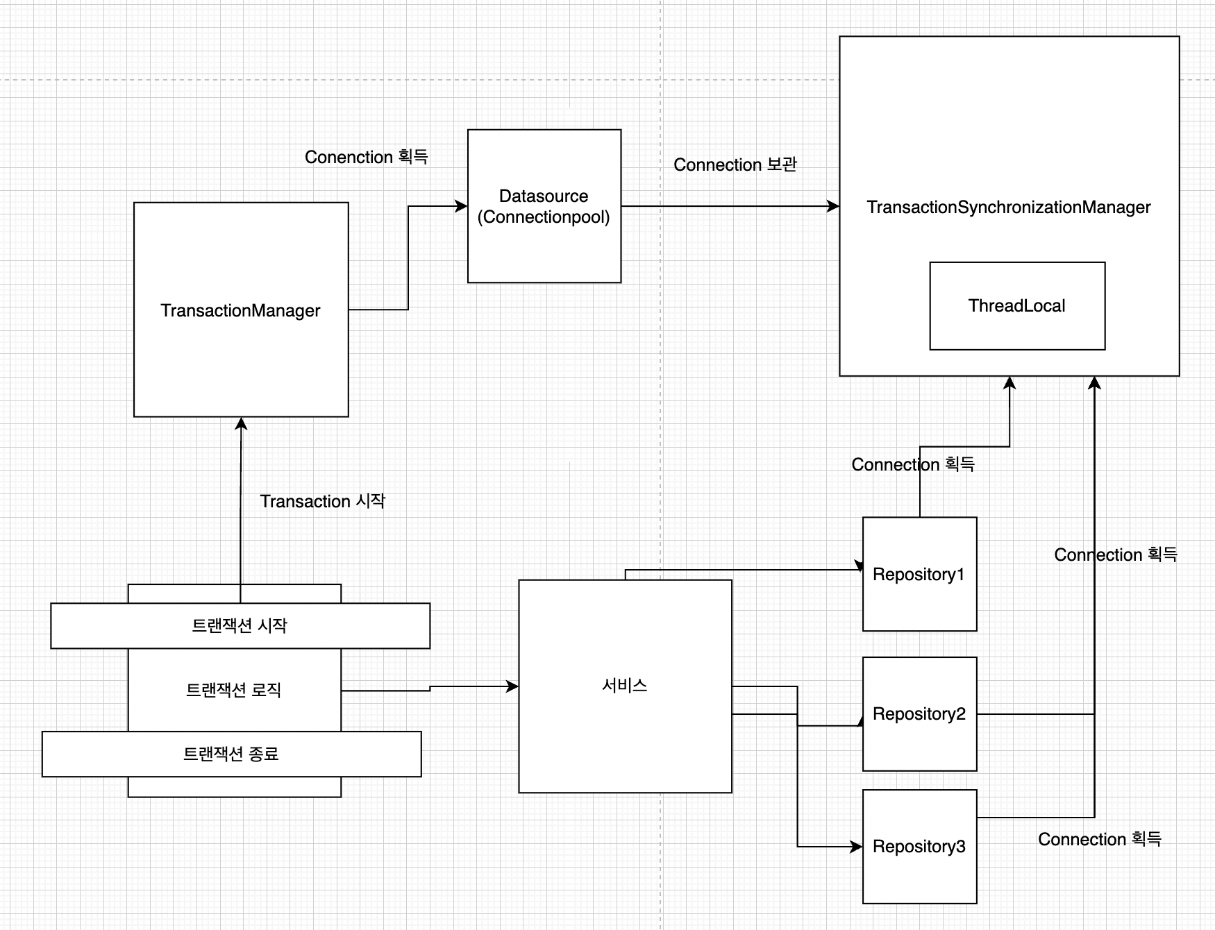 이를 해결하기 위해 TransactionSynchronizationManager는 ThreadLocal에 Connection을 저장해 두고 DB에 접근할 때 마다 동일한 Connection을 사용할 수 있도록 보장해준다.
