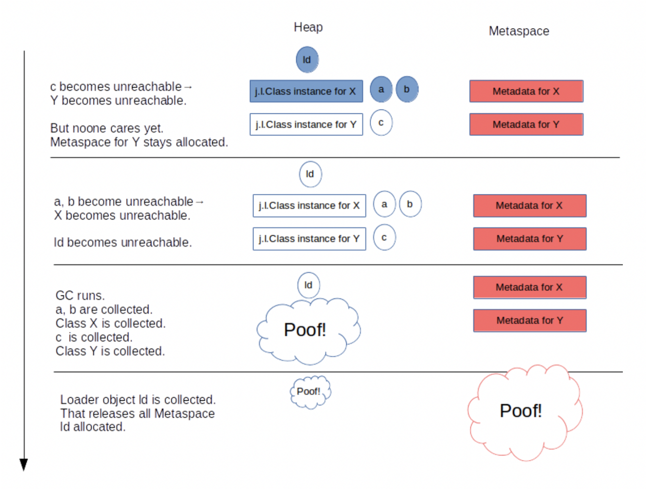 Metaspace의 GC는 기본적으로 Metaspace 공간이 부족하면 발생하게 된다. Metaspace의 대부분의 영역들은 클래스로더가 로드한 메타데이터들일텐데, 이 때 GC의 대상이 되는 메타데이터들은 자신을 로드한 클래스로더가 힙에서 GC 된 것 들이다. 아래 그림을 보면 ld가 힙에 올라간 클래스로더이고 ld가 힙에서 사라져야 Metaspace에서도 GC가 일어나는 것을 확인 할 수 있다.