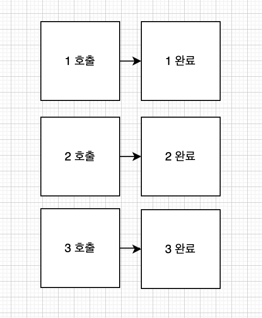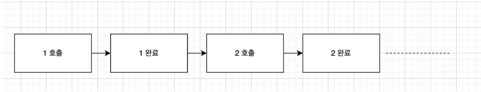 먼저 동기와 비동기의 차이를 간단하게 알아보겠다. 동기로 처리한다는 것은 위의 그림처럼 하나의 요청을 보내고 해당 요청이 완료될 때까지 기다렸다가 새로운 요청을 보낸다는 것을 의미한다.