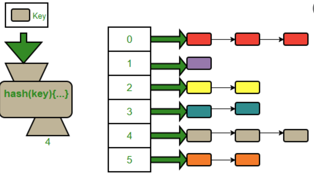 HashMap을 예시로 어떻게 HashTable을 사용하는지 알아보자. HashMap에 put 함수를 이용해서 abc라는 키값에 값을 넣는다고 하면 abc를 Hash 함수를 사용해서 고유한 Int 값을 얻어낸다. 예를들어 abc 키의 HashCode를 54201이라고 하면 54201번째의 index에 넣어야할까? 그렇게 사용하기에는 메모리 낭비가 너무 심하다. 그렇기 때문에 HashTable에는 capacity가 있다. 예를 들어 capacity가 8이라고 하면 길이가 8인 LinkedList로 이루어진 배열을 만들고 54201을 8로 Modulo해서 나머지 값을 index로 사용한다. 54201을 8로 modulo하면 1이 나온다. 원소의 개수가 많아지다보면 index가 동일한 key가 발생하게 된다. 이를 Hash Collision이라고 한다. 예를들어 aaa라는 키의 HashCode도 8로 나누면 abc와 같은 index를 가질 수 있다. 이 경우를 대비해서 LinkedList가 있는 것이다. aaa라는 키는 abc의 LinkedList 뒤쪽에 붙여주게 된다.